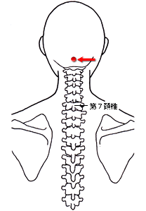 盆のくぼ(うなじの中央のくぼみ)に指を当て、頚椎と頭の骨の境目をさぐります。境目の深いくぼみにあります。 ツボを確認したら、親指の腹で押してみるとはっきりわかります。 頭のてっぺんに突き抜けるような、ビーンといったひびきが伝わります。