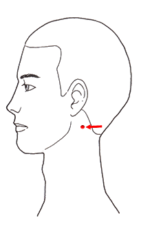 薬指の端で、筋肉の太い束(胸鎖乳突起)の後ろ端にあるくぼみが天ようです。むくみがあると、ゴリゴリとしたしこりがあらわれています。押すと、心地よい痛さのひびきが頭に向かって伝わります。